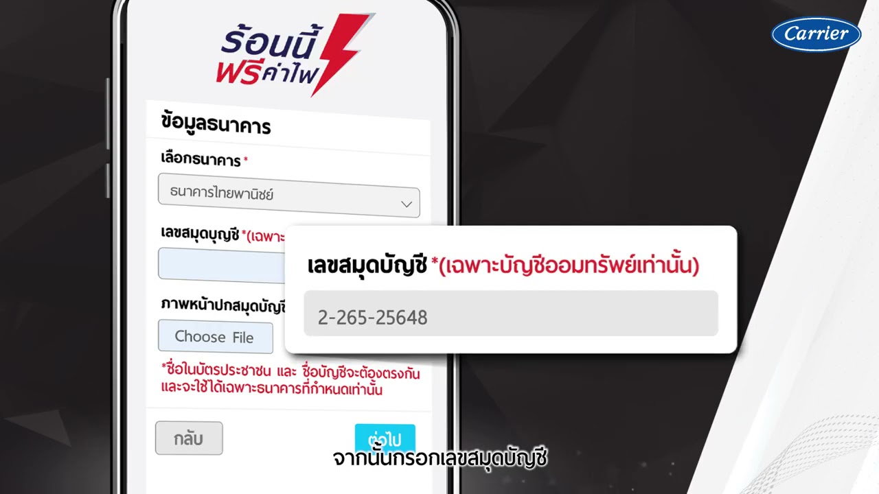 Carrier Thailand ข นตอนการลงทะเบ ยน 1 ลงทะเบ ยนได ท เว บไซต Https Carrierthailand Com Summer2020 หร อ ณ จ ดขาย Homepro Powerbuy ภายใน 15 พฤษภาคม 2563 2 กรอกช อ สก ล และเบอร โทรศ พท พร อมท งเเนบภาพถ ายหน าบ ตรประชาชน 3 เล อกธนาคารท ต องการ